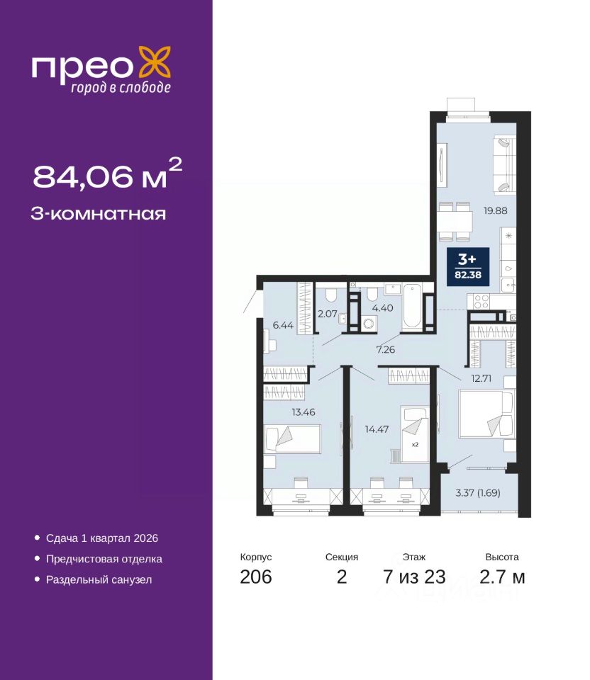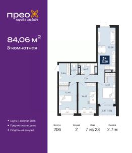 Продается 3-комн. квартира с предчистовой отделкой в ЖК "Прео" на 7 этаже. Общая площадь: 84.06 кв.м. Высота потолков 2.7 м.