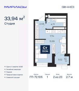 Продается 1-комн. квартира-студия от застройщика с предчистовой отделкой в ЖК "Мириады" на 2 этаже. Общая площадь: 33.94 кв.м., площадь гостиной 23.73 кв.м., из которых 7.74 кв.м. выделено под кухонную зону. Все окна выходят на одну сторону. В квартире одна лоджия, один совмещенный санузел. Высота потолков 2.7 м.