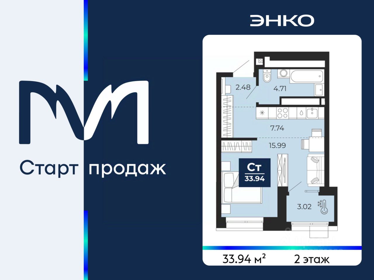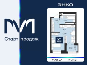 1-комн. квартира-студия от застройщика с предчистовой отделкой в ЖК "Мириады" на 2 этаже. Общая площадь: 33.94 кв.м., площадь гостиной 23.73 кв.м., из которых 7.74 кв.м. выделено под кухонную зону. Все окна выходят на одну сторону. В квартире одна лоджия, один совмещенный санузел. Высота потолков 2.7 м.