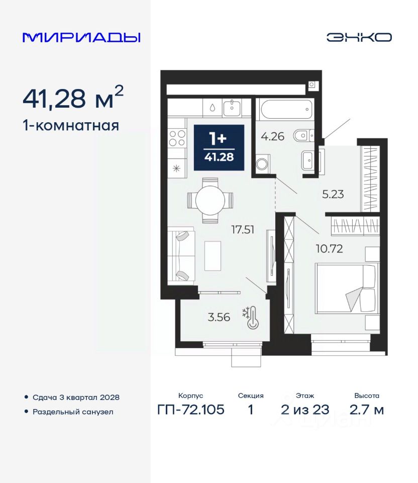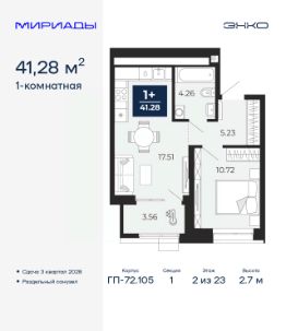 Просторная 1-комн. квартира в ЖК "Мириады" на 2 этаже. Общая площадь: 41.28 кв.м. Высота потолков 2.7 м.