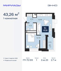 Просторная однокомнатная квартира в ЖК "Мириады" на 2 этаже. Общая площадь: 43.26 кв.м. Высота потолков 2.7 м.