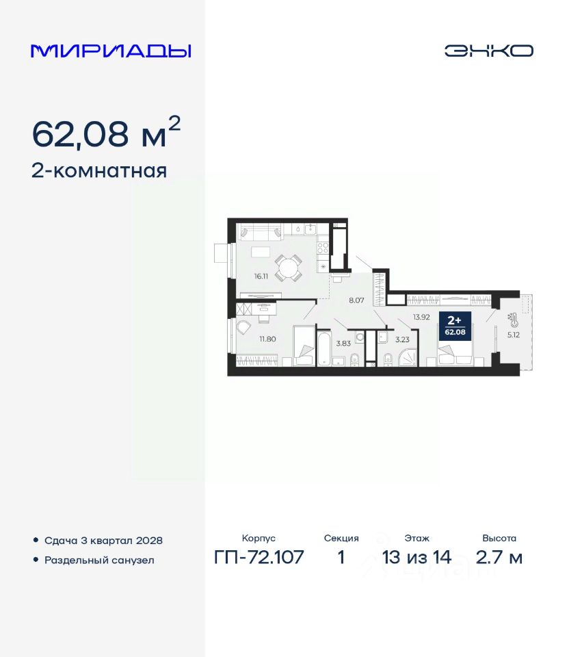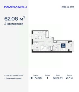 2-комн. квартира в ЖК "Мириады" на 13 этаже. Общая площадь: 62.08 кв.м. Высота потолков 2.7 м.