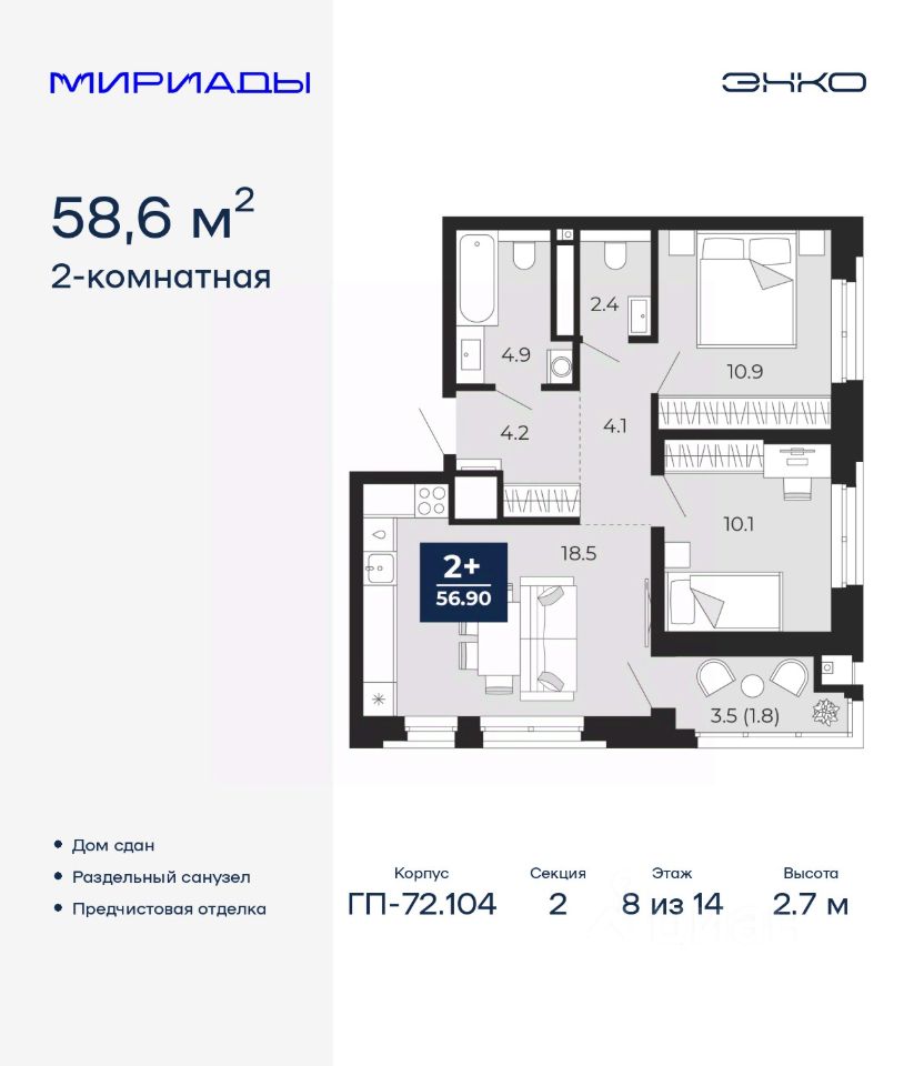 Двухкомнатная квартира от застройщика с предчистовой отделкой в ЖК "Мириады" на 8 этаже. Общая площадь: 58.6 кв.м. Высота потолков 2.7 м.