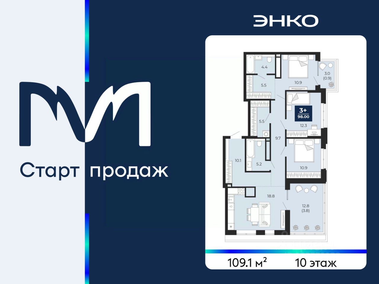 Продается трехкомнатная квартира с предчистовой отделкой в ЖК "Мириады" на 10 этаже. Общая площадь: 109.1 кв.м. Высота потолков 2.7 м.