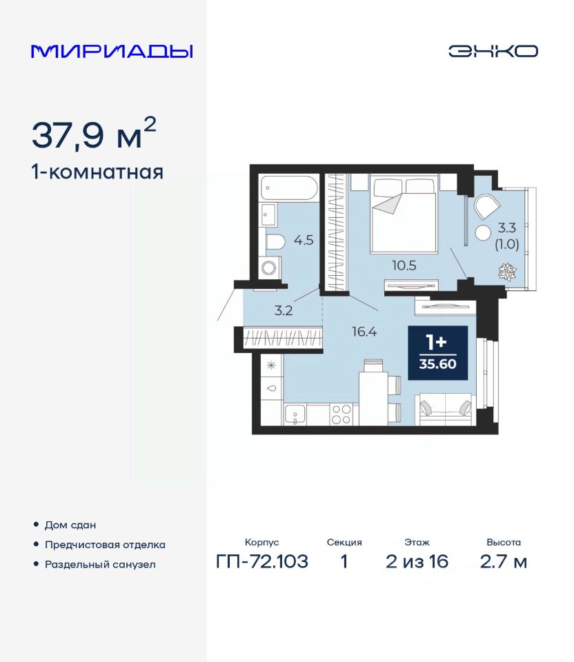 Продается 1-комн. квартира с предчистовой отделкой в ЖК "Мириады" на 2 этаже. Общая площадь: 37.9 кв.м. Высота потолков 2.7 м.