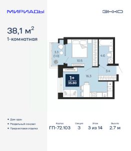 1-комн. квартира с предчистовой отделкой в ЖК "Мириады" на 3 этаже. Общая площадь: 38.1 кв.м. Высота потолков 2.7 м.