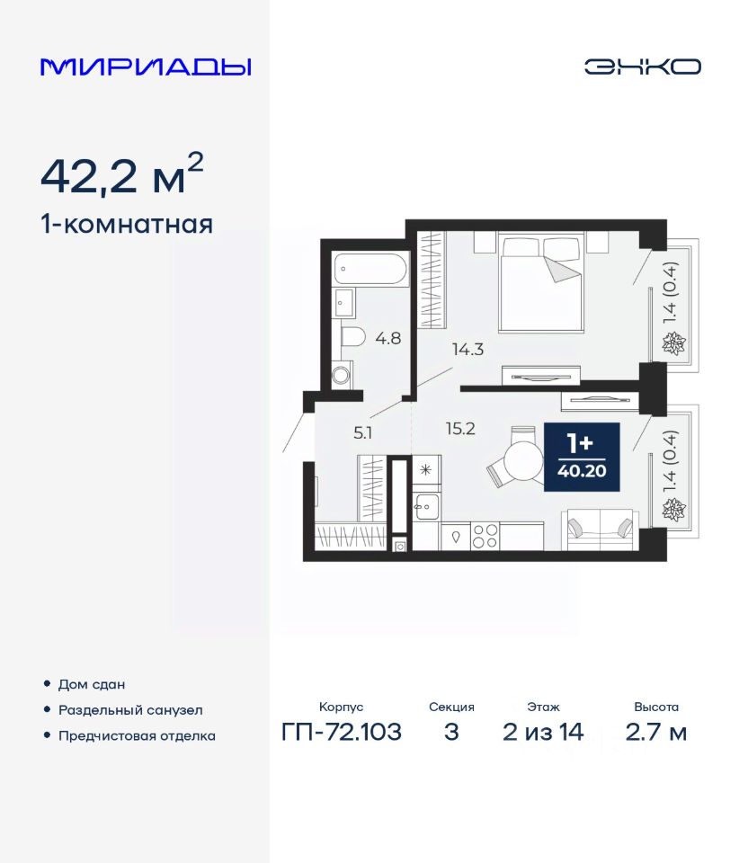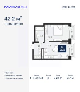 Продается 1-комн. квартира с предчистовой отделкой в ЖК "Мириады" на 2 этаже. Общая площадь: 42.2 кв.м. Высота потолков 2.7 м.