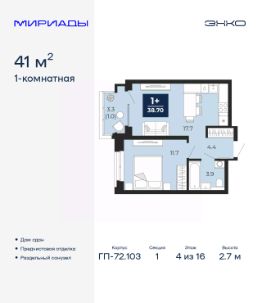 Однокомнатная квартира с предчистовой отделкой в ЖК "Мириады" на 4 этаже. Общая площадь: 41 кв.м. Высота потолков 2.7 м.