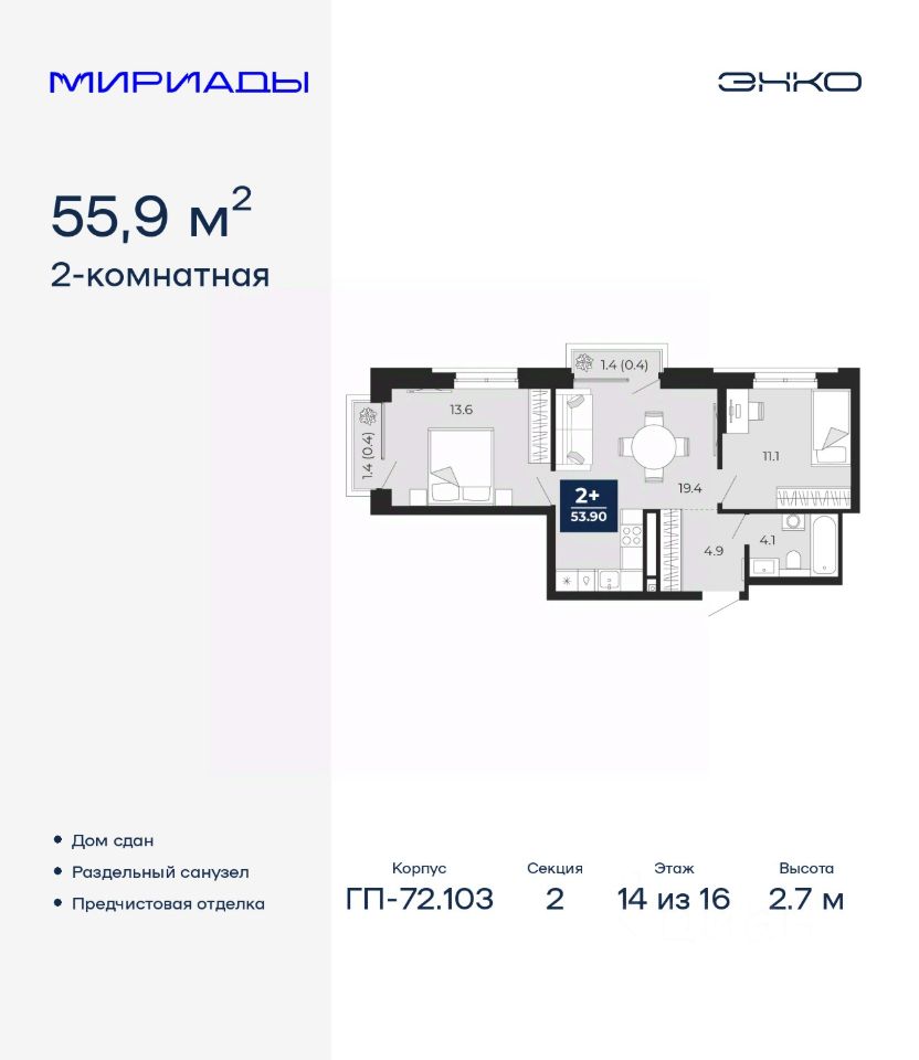 Просторная двухкомнатная квартира с предчистовой отделкой в ЖК "Мириады" на 14 этаже. Общая площадь: 55.9 кв.м. Высота потолков 2.7 м.