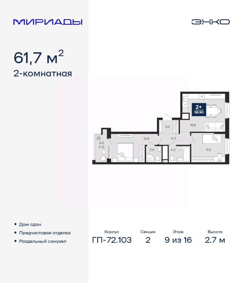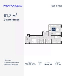 Просторная 2-комн. квартира с предчистовой отделкой в ЖК "Мириады" на 9 этаже. Общая площадь: 61.7 кв.м. Высота потолков 2.7 м.