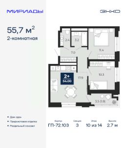 Просторная двухкомнатная квартира с предчистовой отделкой в ЖК "Мириады" на 10 этаже. Общая площадь: 55.7 кв.м. Высота потолков 2.7 м.