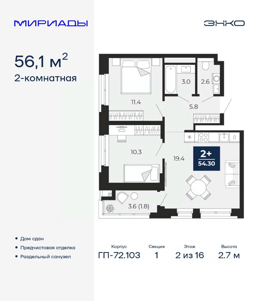 Двухкомнатная квартира от застройщика с предчистовой отделкой в ЖК "Мириады" на 2 этаже. Общая площадь: 56.1 кв.м. Высота потолков 2.7 м.
