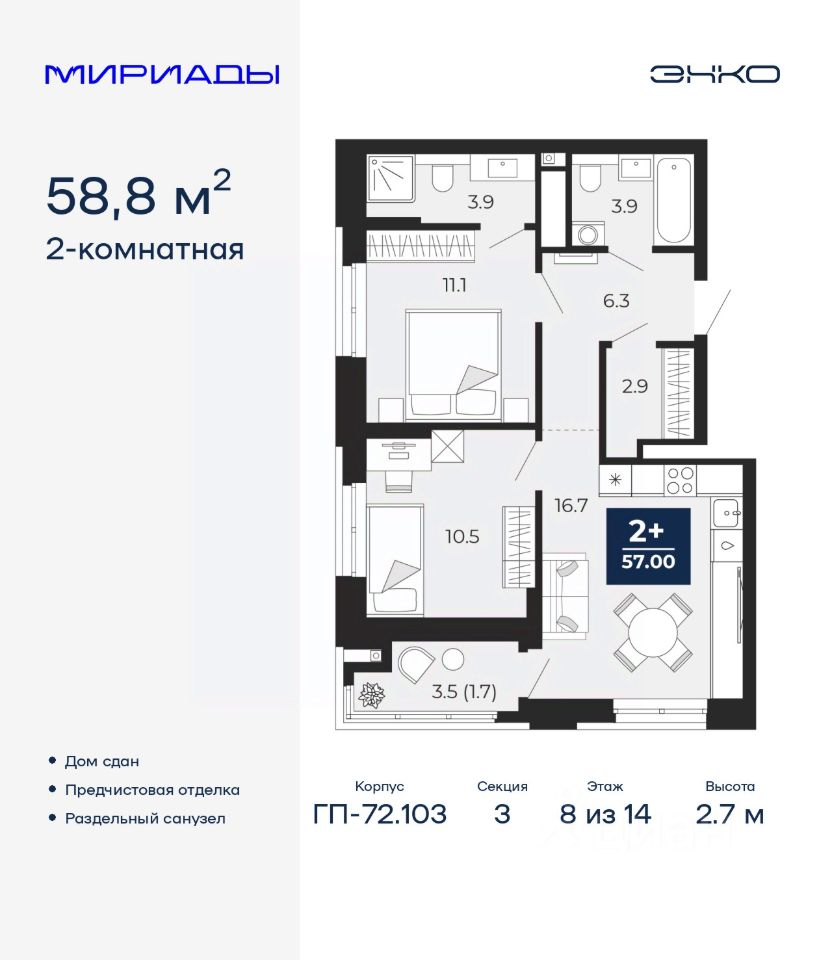 Просторная 2-комн. квартира с предчистовой отделкой в ЖК "Мириады" на 8 этаже. Общая площадь: 58.8 кв.м. Высота потолков 2.7 м.