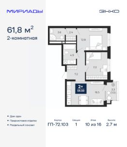 Двухкомнатная квартира с предчистовой отделкой в ЖК "Мириады" на 10 этаже. Общая площадь: 61.8 кв.м. Высота потолков 2.7 м.