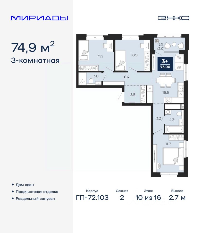 Просторная 3-комн. квартира с предчистовой отделкой в ЖК "Мириады" на 10 этаже. Общая площадь: 74.9 кв.м. Высота потолков 2.7 м.