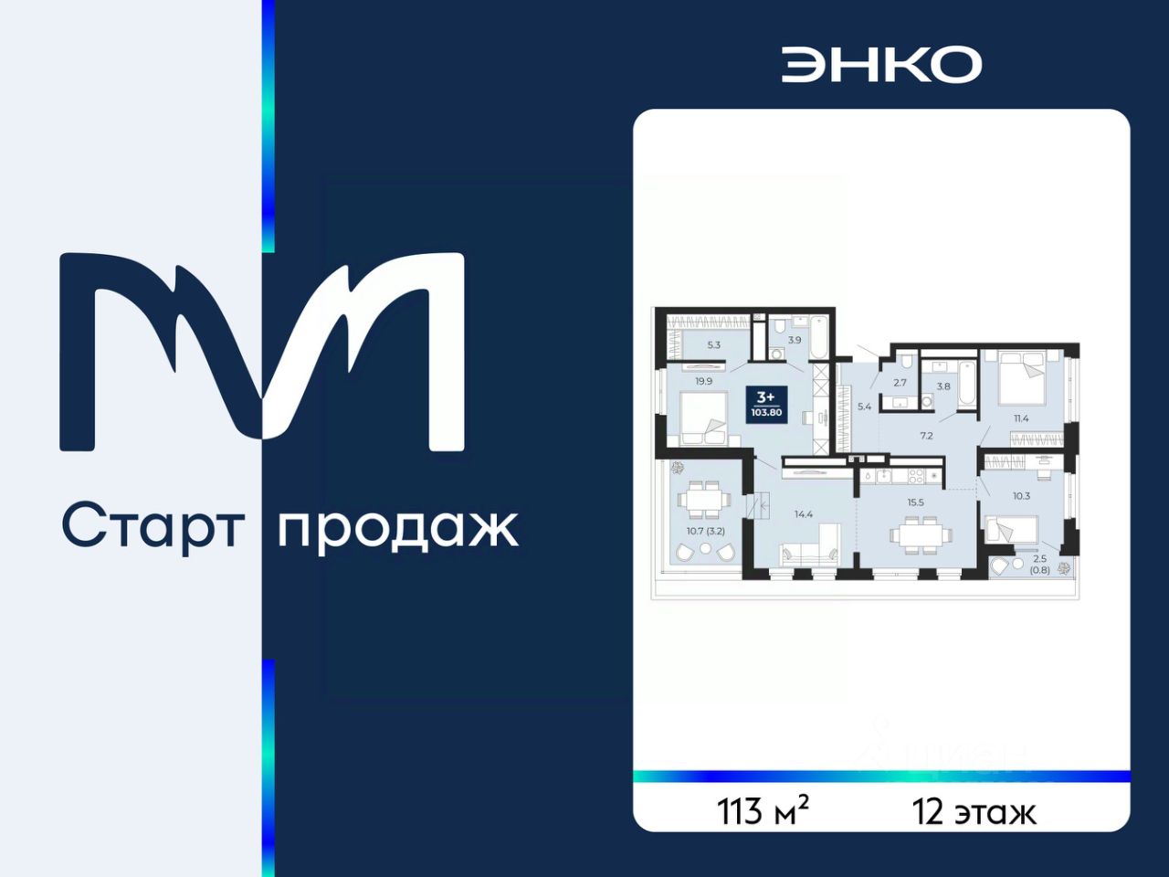 3-комн. квартира с предчистовой отделкой в ЖК "Мириады" на 12 этаже. Общая площадь: 113 кв.м. Высота потолков 2.7 м.