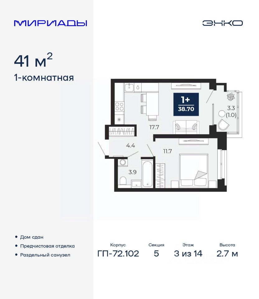 1-комн. квартира от застройщика с предчистовой отделкой в ЖК "Мириады" на 3 этаже. Общая площадь: 41 кв.м. Высота потолков 2.7 м.