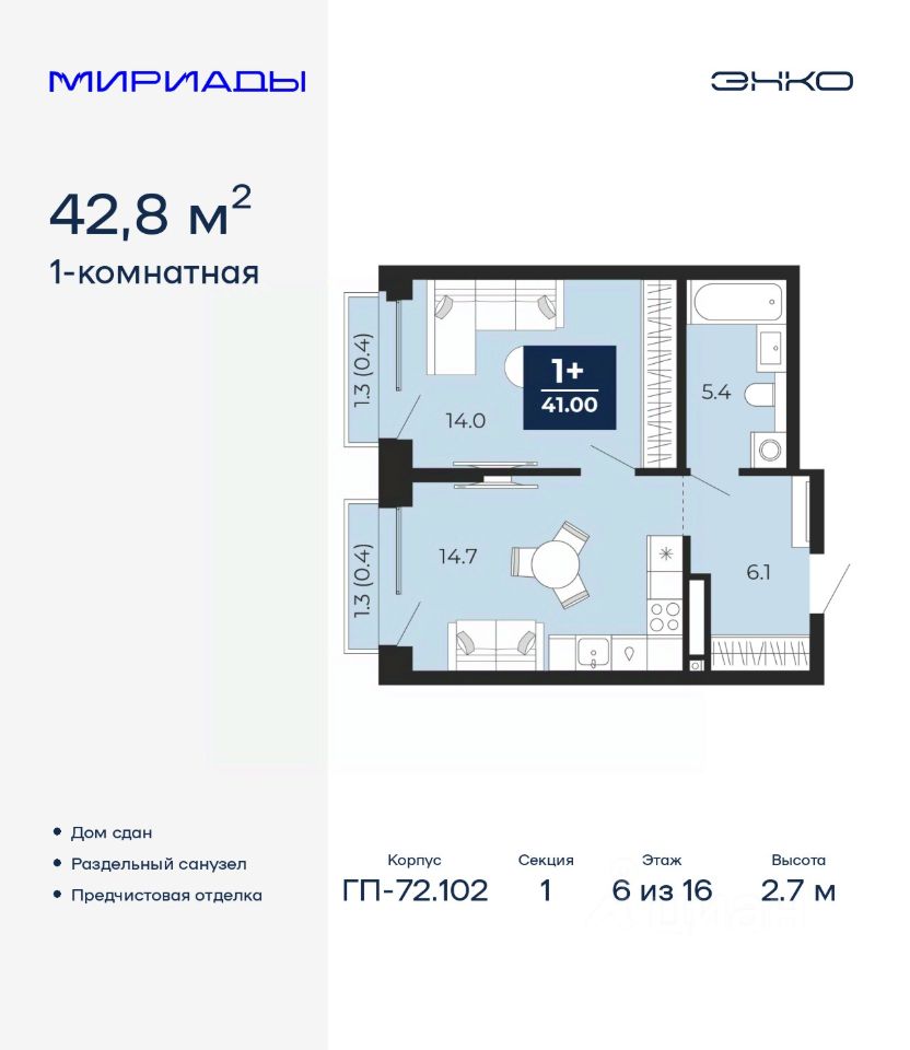 Продается 1-комн. квартира с предчистовой отделкой в ЖК "Мириады" на 6 этаже. Общая площадь: 42.8 кв.м. Высота потолков 2.7 м.