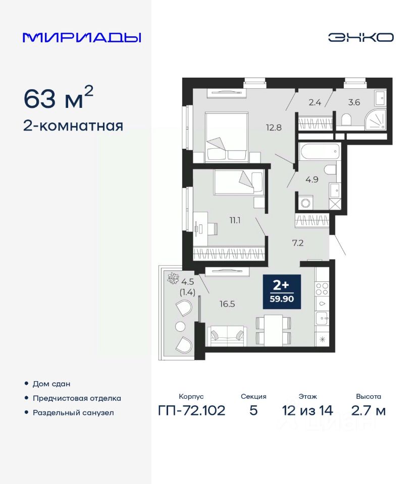 2-комн. квартира с предчистовой отделкой в ЖК "Мириады" на 12 этаже. Общая площадь: 63 кв.м. Высота потолков 2.7 м.