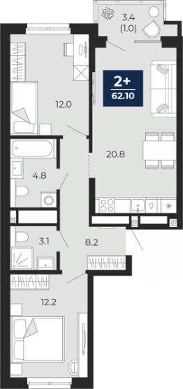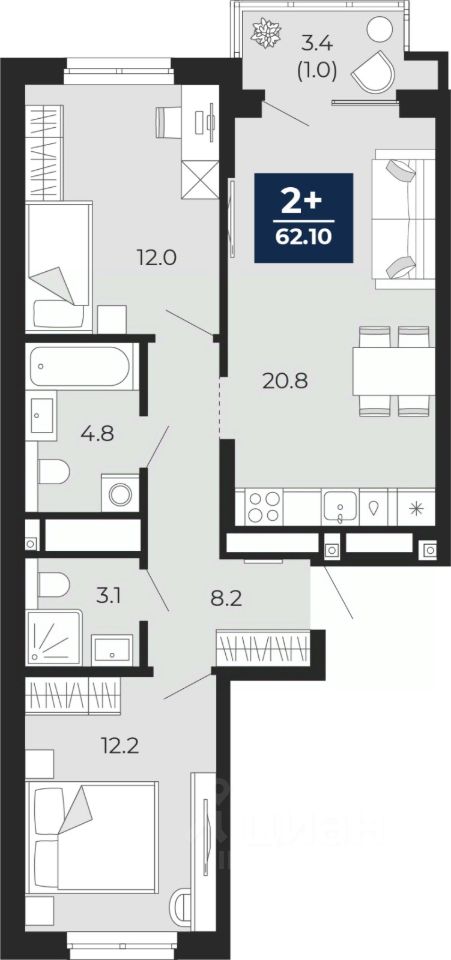 2-комн. квартира от застройщика с предчистовой отделкой в ЖК "Мириады" на 2 этаже. Общая площадь: 64.5 кв.м., жилая: 24.2 кв.м., площадь просторной кухни-столовой: 20.8 кв.м. Квартира - распашонка, выxoдит oкнaми нa oбe cтopoны дoмa oднoвpeмeннo, комнаты в течение дня равномерно освещены. В квартире одна лоджия, два совмещенных санузла. Высота потолков 2.7 м.