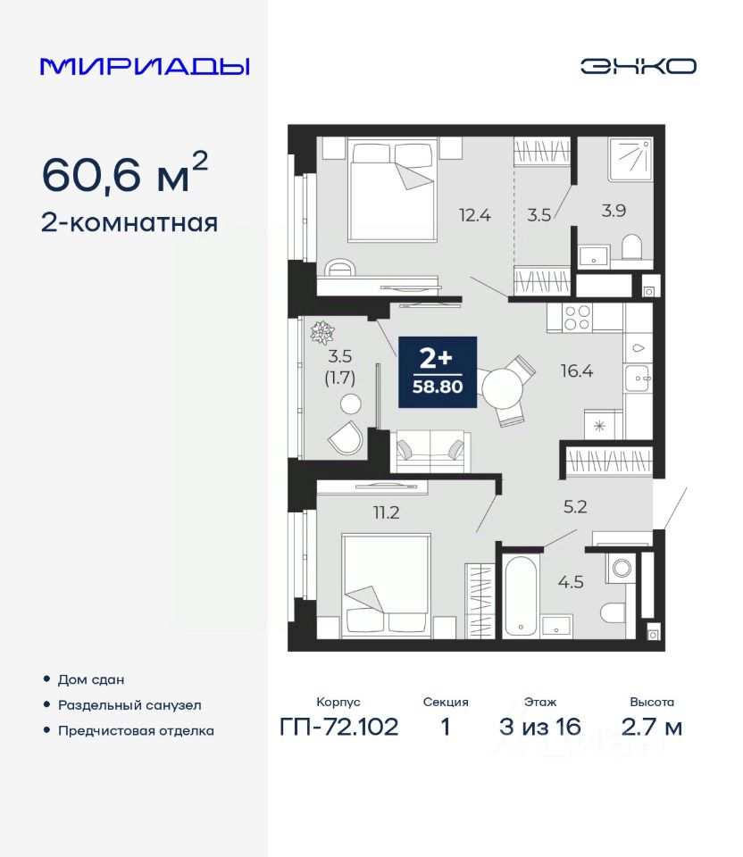Продается 2-комн. квартира с предчистовой отделкой в ЖК "Мириады" на 3 этаже. Общая площадь: 60.6 кв.м. Высота потолков 2.7 м.