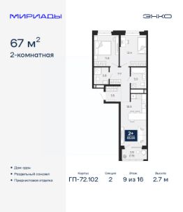 2-комн. квартира с предчистовой отделкой в ЖК "Мириады" на 9 этаже. Общая площадь: 67 кв.м. Высота потолков 2.7 м.