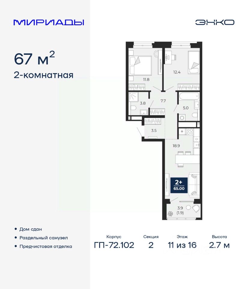 2-комн. квартира с предчистовой отделкой в ЖК "Мириады" на 11 этаже. Общая площадь: 67 кв.м. Высота потолков 2.7 м.