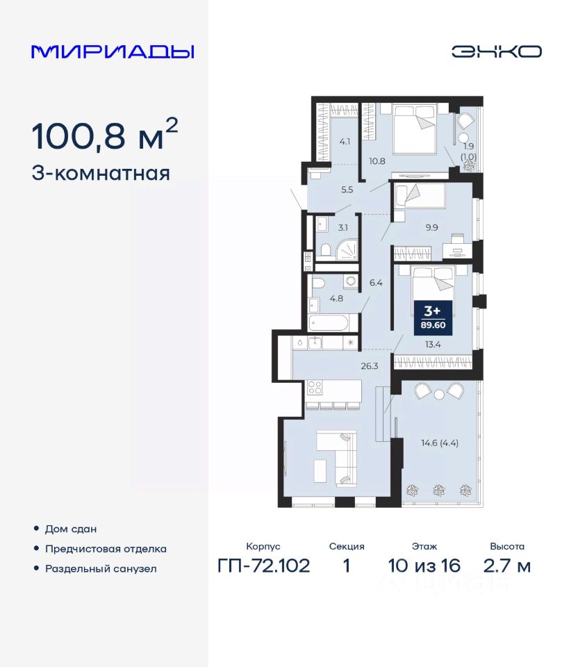 3-комн. квартира с предчистовой отделкой в ЖК "Мириады" на 10 этаже. Общая площадь: 100.8 кв.м. Высота потолков 2.7 м.