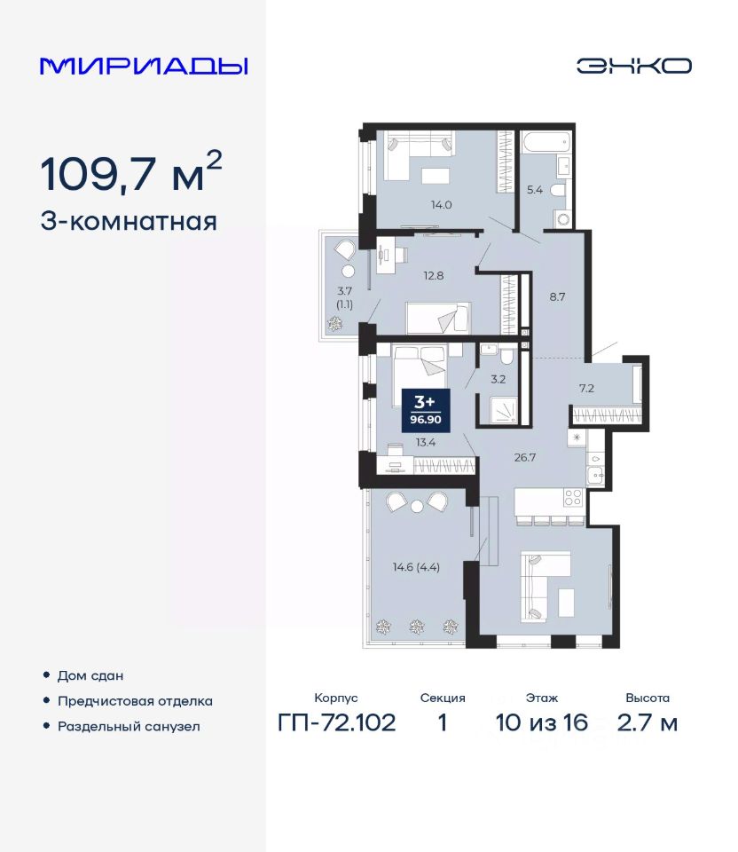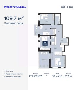 Трехкомнатная квартира с предчистовой отделкой в ЖК "Мириады" на 10 этаже. Общая площадь: 109.7 кв.м. Высота потолков 2.7 м.