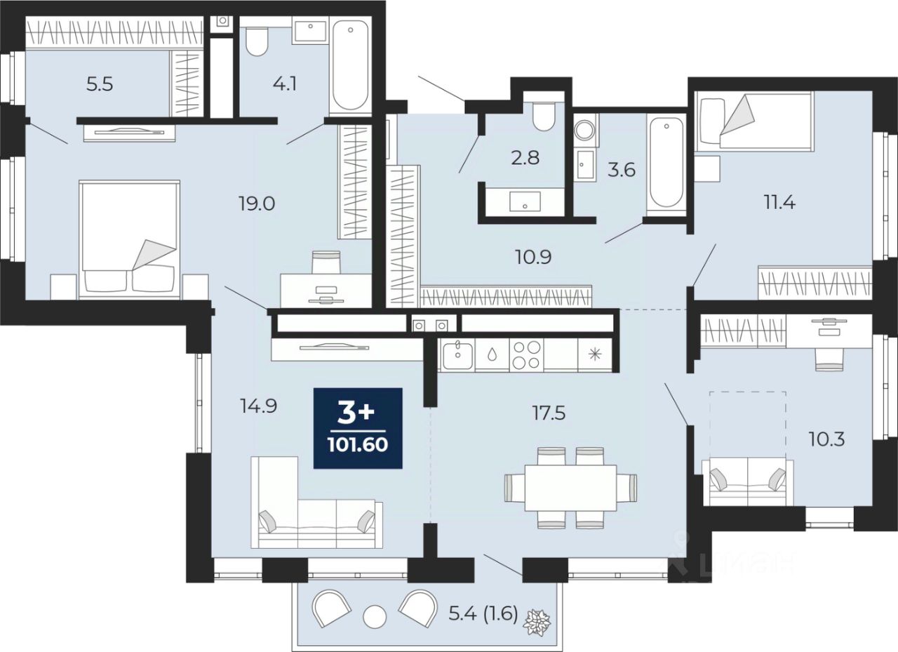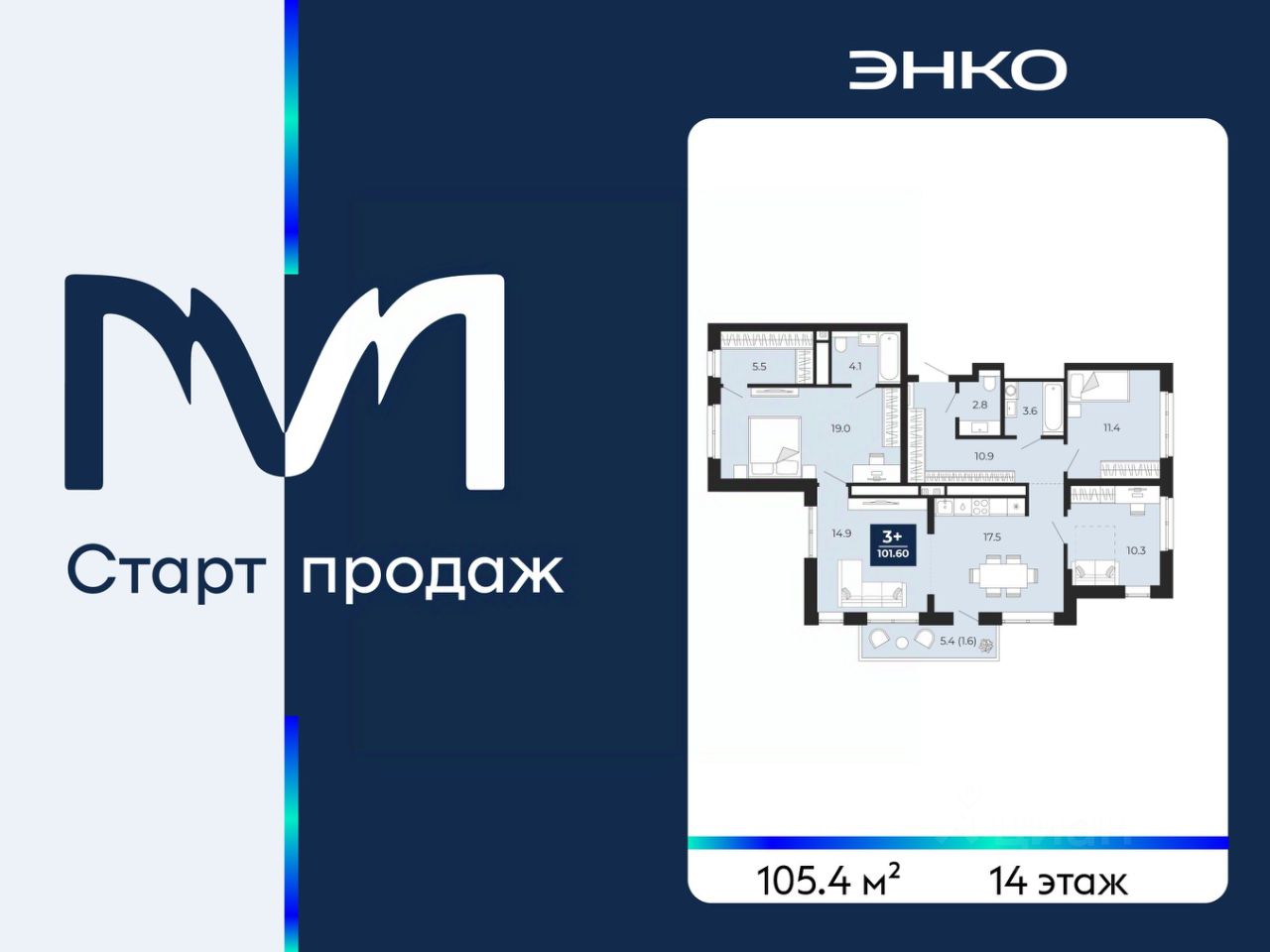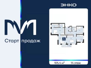 Продается 3-комн. квартира с предчистовой отделкой в ЖК "Мириады" на 14 этаже. Общая площадь: 105.4 кв.м. Высота потолков 2.7 м.