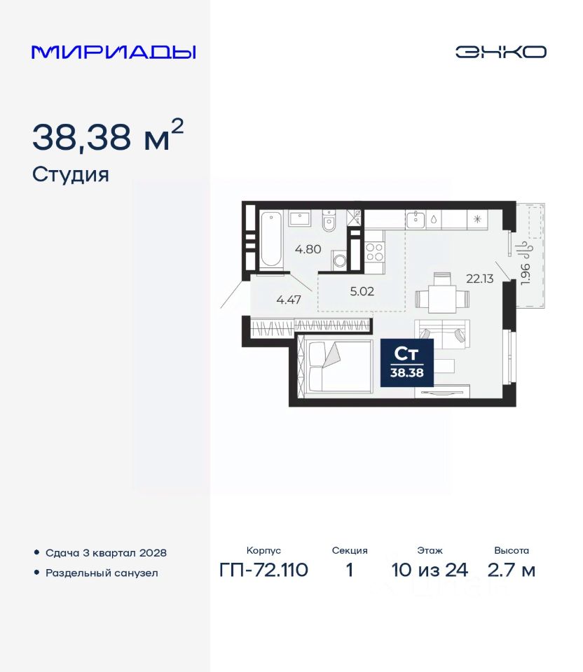 Просторная 1-комн. квартира-студия в ЖК "Мириады" на 10 этаже. Общая площадь: 38.38 кв.м. Высота потолков 2.7 м.