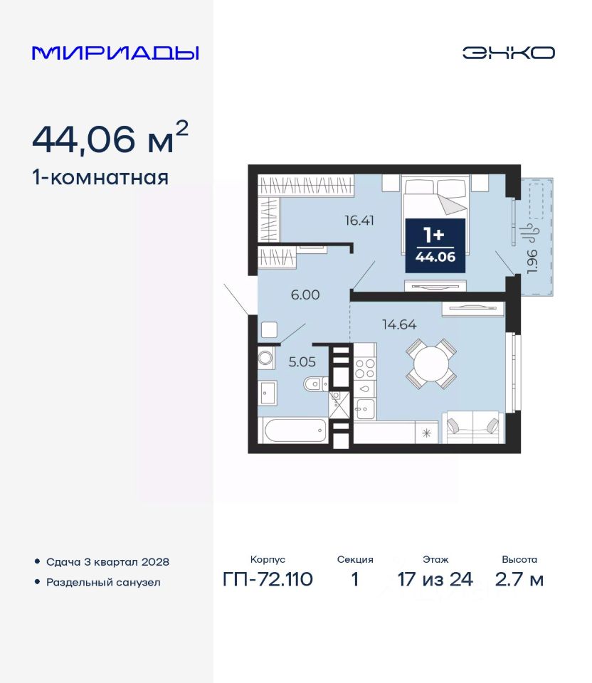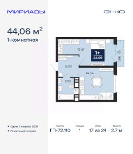 Просторная 1-комн. квартира в ЖК "Мириады" на 17 этаже. Общая площадь: 44.06 кв.м. Высота потолков 2.7 м.