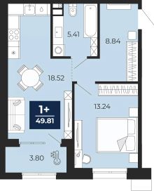 Просторная 1-комн. квартира в ЖК "Мириады" на 1 этаже. Общая площадь: 49.81 кв.м. Высота потолков 2.7 м.