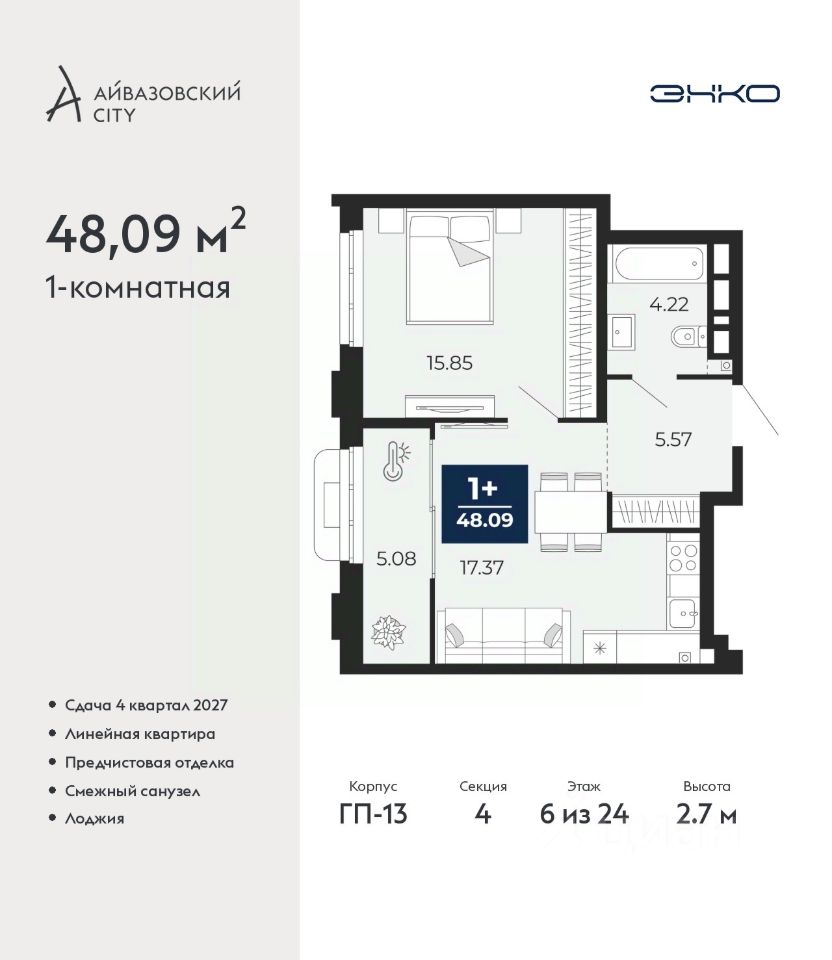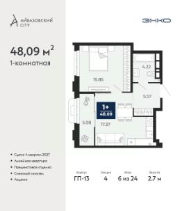 Однокомнатная квартира с предчистовой отделкой в ЖК "Айвазовский City" на 6 этаже. Общая площадь: 48.09 кв.м., жилая: 15.85 кв.м., площадь просторной кухни-столовой: 17.37 кв.м. Все окна выходят на одну сторону. В квартире одна лоджия, один совмещенный санузел. Высота потолков 2.7 м.