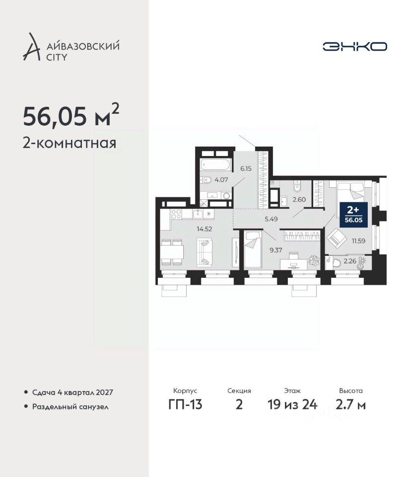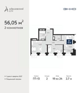 2-комн. квартира в ЖК "Айвазовский City" на 19 этаже. Общая площадь: 56.05 кв.м. Высота потолков 2.7 м.