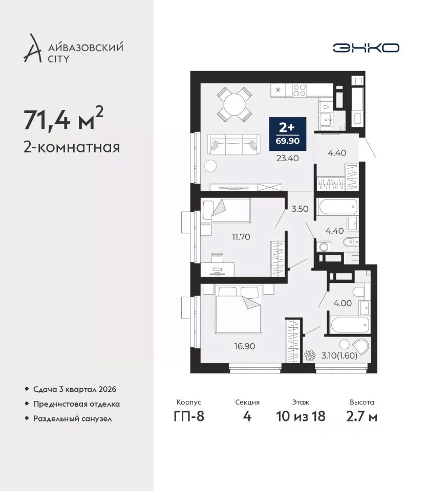 Продается двухкомнатная квартира с предчистовой отделкой в ЖК "Айвазовский City" на 10 этаже. Общая площадь: 71.4 кв.м. Высота потолков 2.7 м.