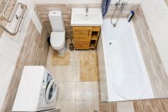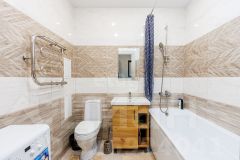 Санузел выполнен с заботой о вашем комфорте и оснащен всем необходимым: здесь вы найдете современную плитку на стенах, полноценную ванну, раковину, унитаз и удобный полотенцесушитель. Каждый элемент продуман до мелочей, чтобы вы могли наслаждаться каждым моментом.