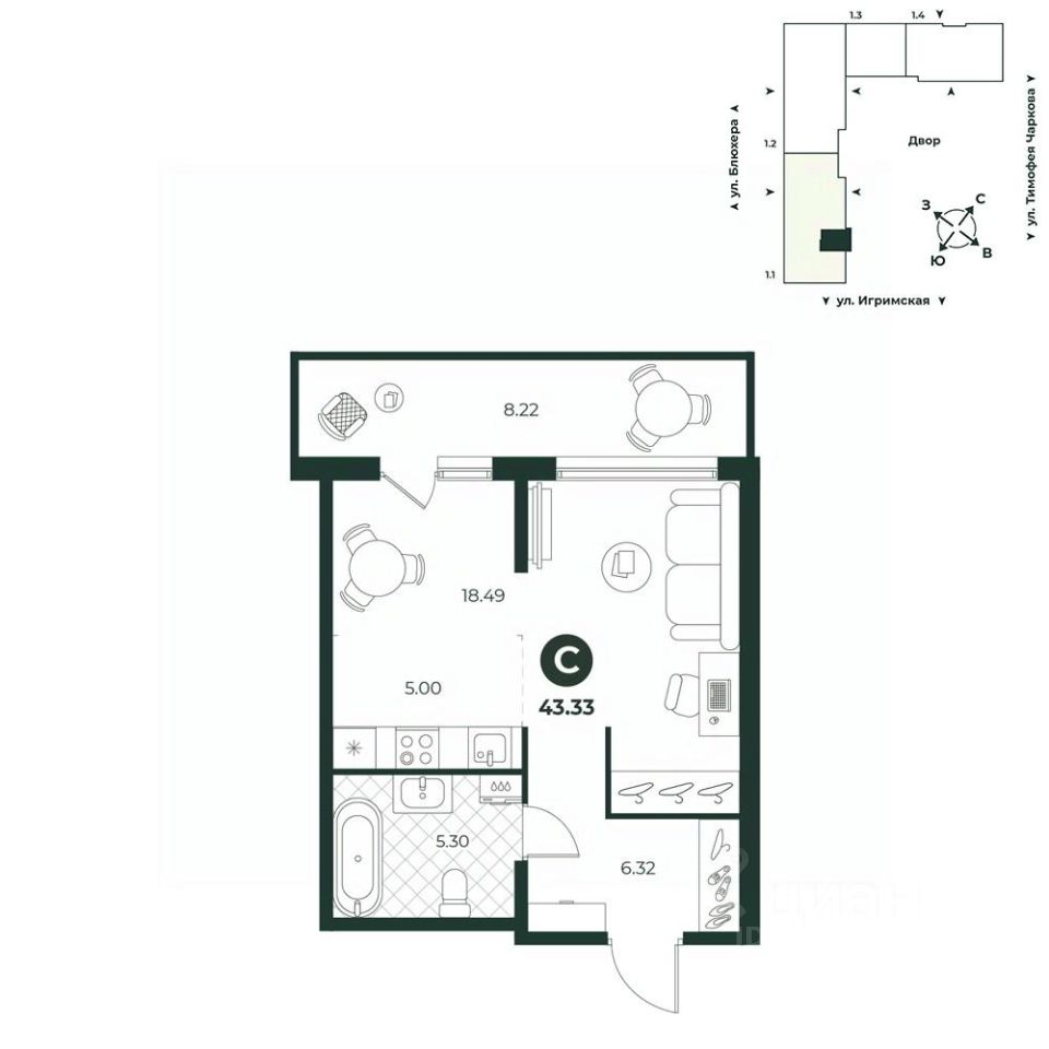 Просторная студия с собственной террасой. В комнате выделена зона под кухонный гарнитур, достаточно пространства для отдыха, предусмотрена ниша под гардеробную.