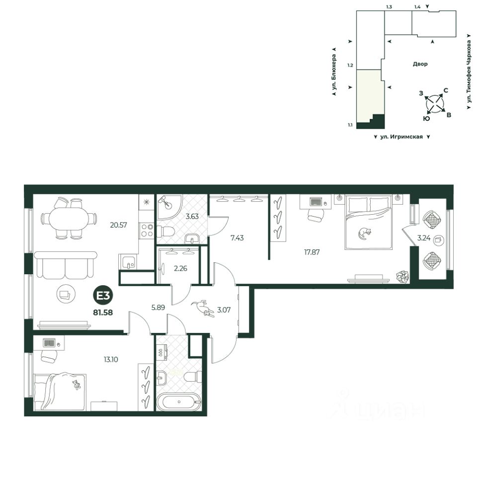 Евротрехкомнатная квартира с мастер-спальней, в которой есть санузел и гардеробная. Площадь кухни-гостиной позволит разделить пространство на функциональные зоны - отдыха и приготовления пищи. Окна квартиры выходят на две стороны. В одной из спален есть лоджия.