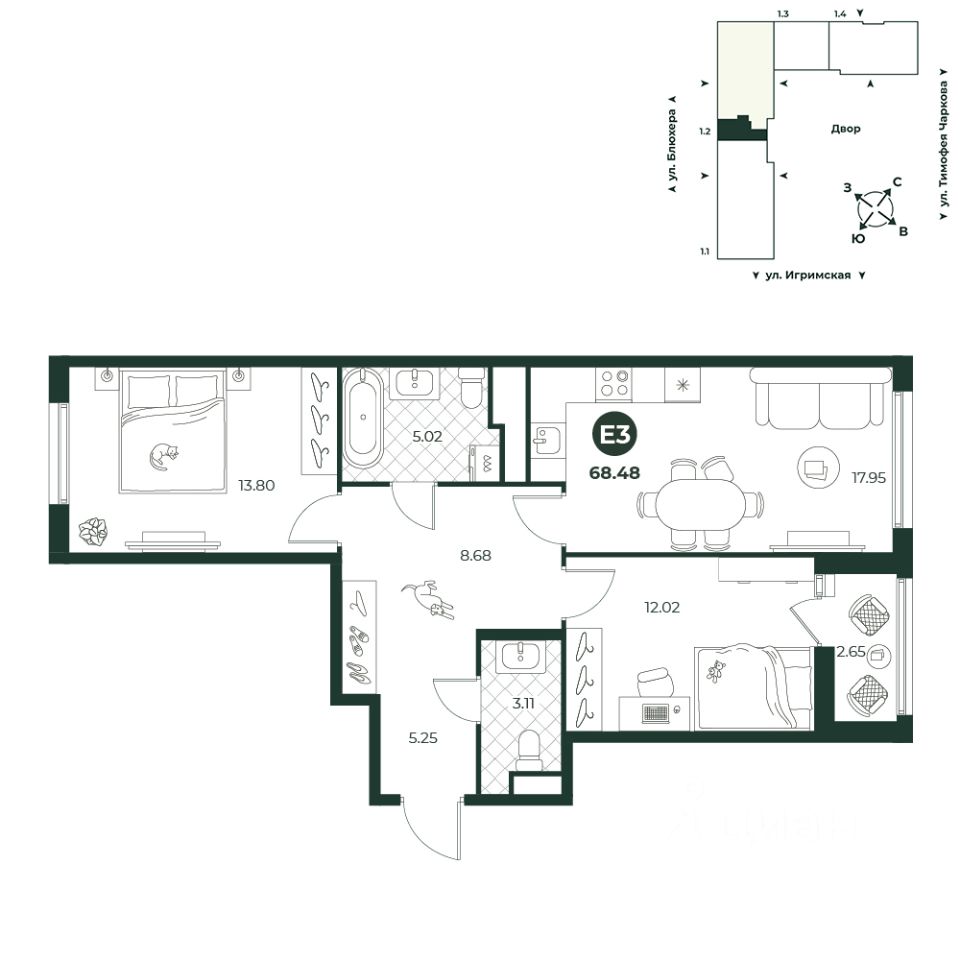 Евротрехкомнатная квартира с просторной кухней-гостиной и двумя санузлами. Площадь прихожей позволяет установить вместительный шкаф. Из спальни предусмотрен выход на лоджию. Окна на две стороны.