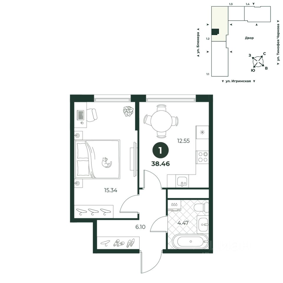 Однокомнатная квартира с просторной спальней. Окна выходят на променад. В прихожей можно установить вместительный шкаф или организовать полноценную гардеробную.