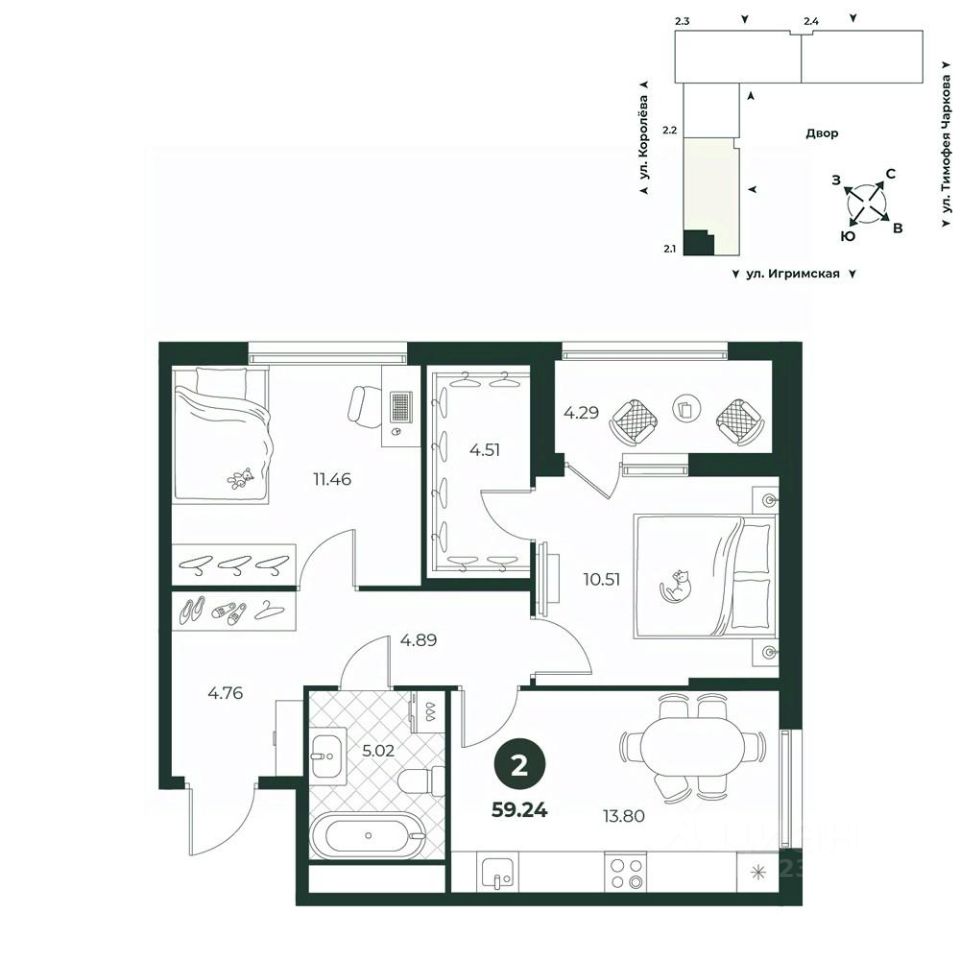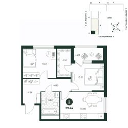 Двухкомнатная квартира с мастер-спальней, оборудованной гардеробной и лоджией. Просторная ванная комната позволит установить стиральную и сушильную машины. В прихожей есть место под шкаф.