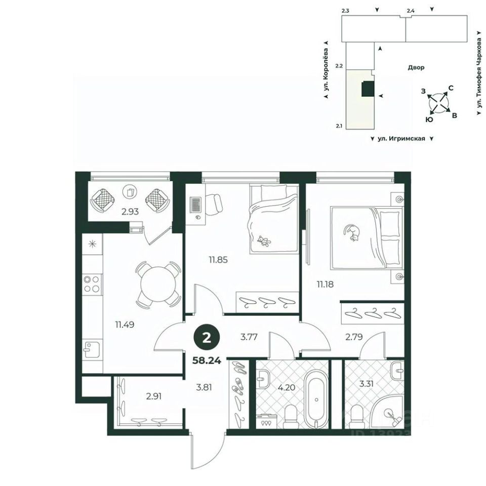 Классическая двухкомнатная квартира с мастер-спальней оборудованной санузлом и гардеробной. Система хранения предусмотрена и в прихожей. Из кухни можно выйти на лоджию.