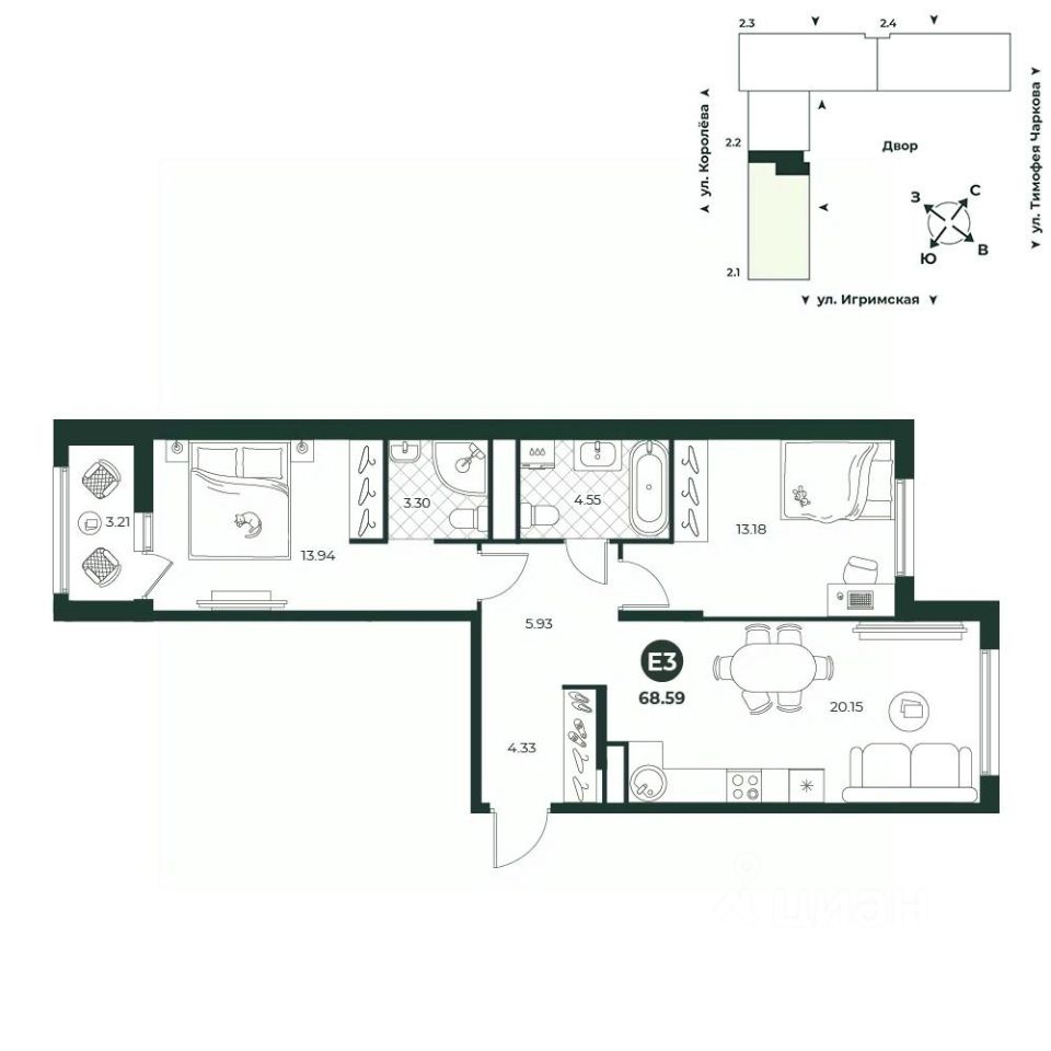 Евротрехкомнатная квартира с мастер-спальней и выходом на лоджию. Раздельные санузлы повышают комфорт и гигиену, позволяют не создавать очередей. Просторная кухня-гостиная дает возможность собрать большую семью вместе за праздниным столом. Окна выходят на две стороны.