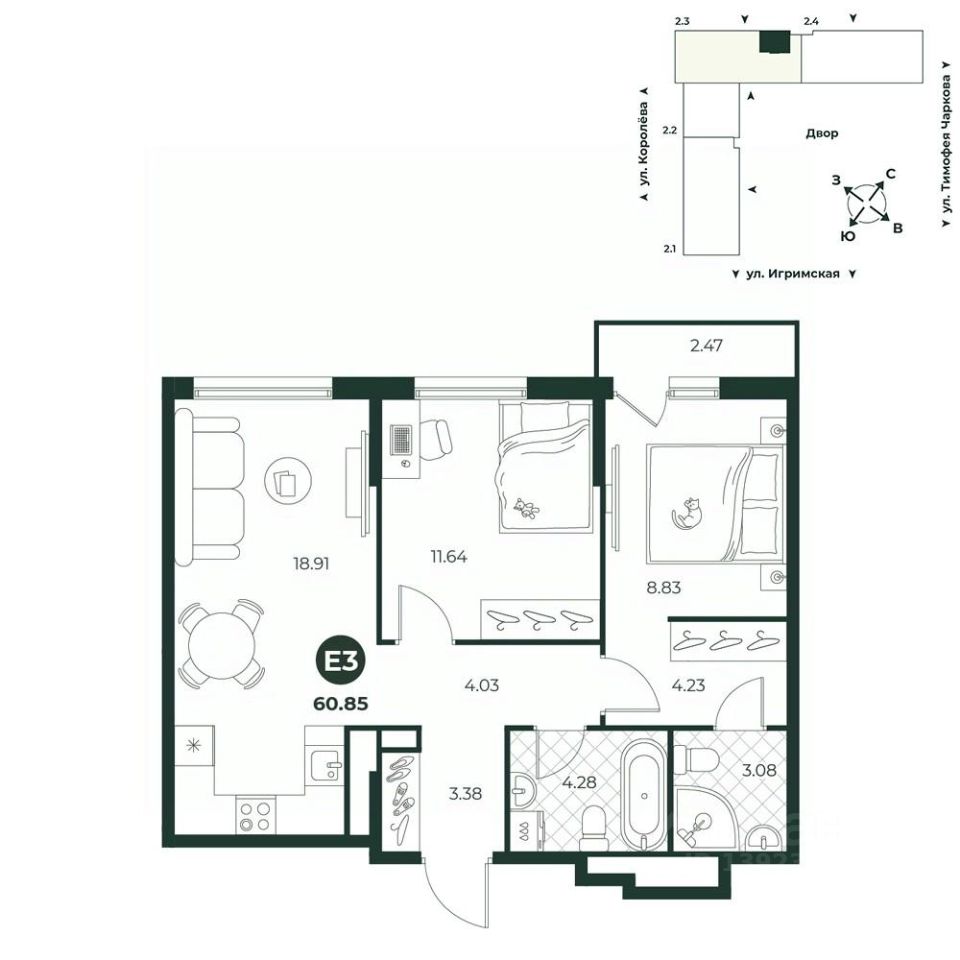 Евротрехкомнатная квартира с мастер-спальней, оборудованной гардеробной и личным выходом на французский балкон. Просторная кухня-гостиная улучшает естественное освещение, позволяет комфортно разместить всю семью и гостей. В квартире предусмотрено два санузла. В прихожей есть ниша под шкаф.