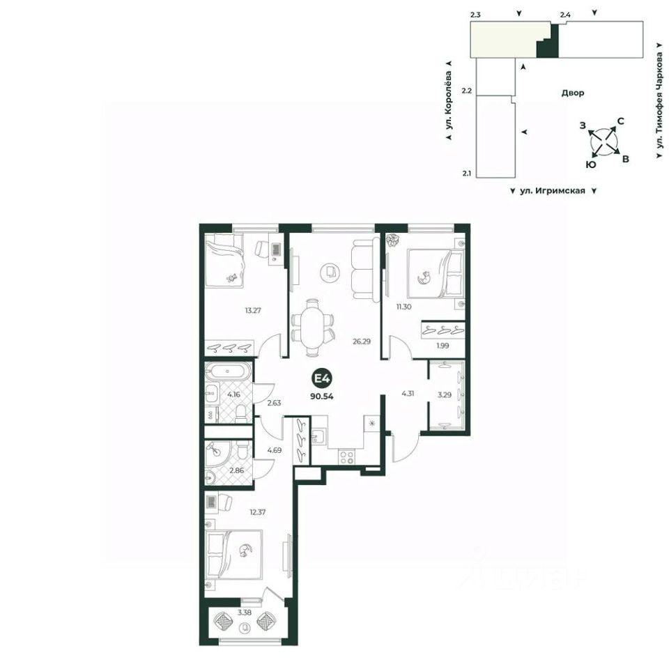 Еврочетырехкомнатная квартира с мастер-спальней и просторной кухней-гостиной для большой семьи. Планировкой предусмотрено два санузла и лоджия, выйти на которую можно из спальни. В прихожей есть место под гардеробную. Окна на две стороны.