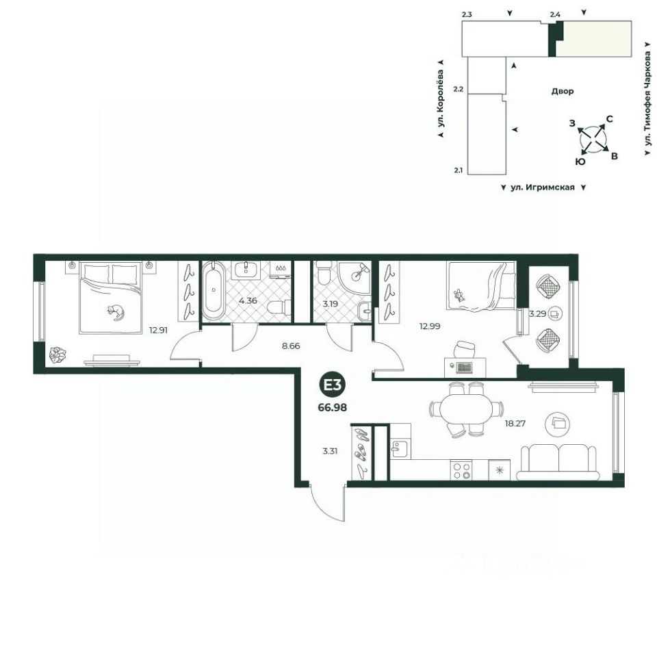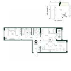 Евротрехкомнатная квартира с лоджией в одной из спален. Кухня-гостиная позволяет разграничить рабочую зону и зону отдыха. В прихожей предусмотрена ниша под шкаф. Окна выходят на две стороны.