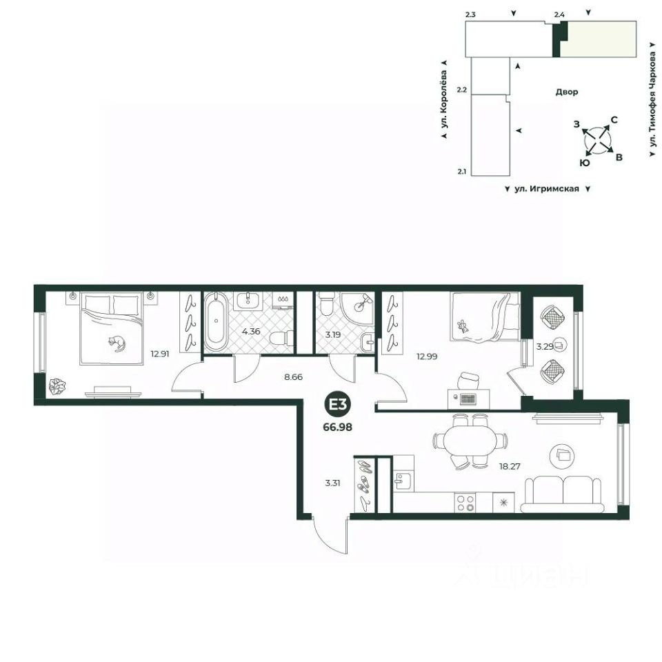 Евротрехкомнатная квартира с просторной кухней-гостиной и двумя санузлами. Площадь прихожей позволяет установить вместительный шкаф. Из спальни предусмотрен выход на лоджию. Окна на две стороны.