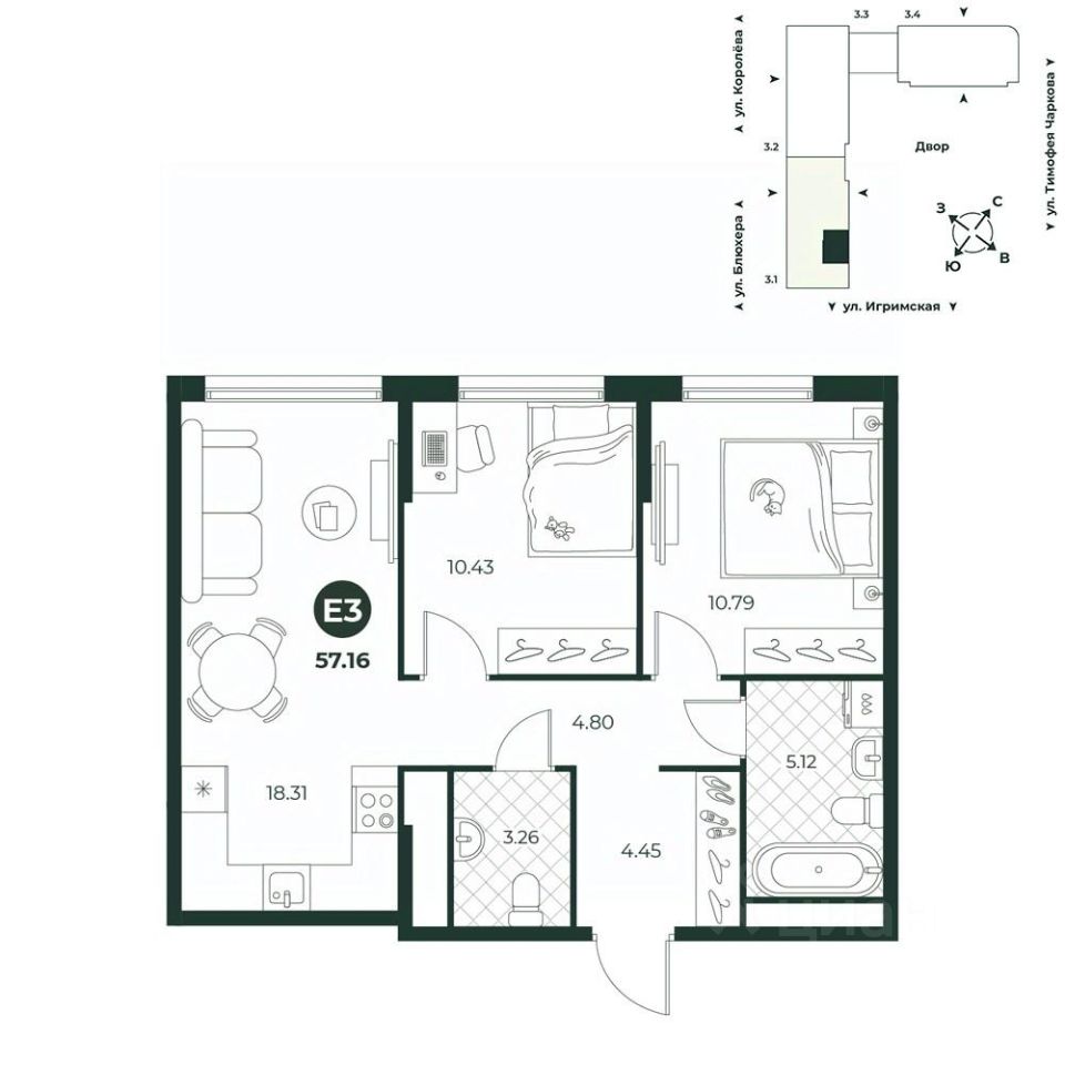 Евротрехкомнатная квартира с просторной кухней-гостиной, где будет комфортно готовить и проводить семейные ужины. Планировкой предусмотрено два санузла - гостевой и полноценная ванная комната. В прихожей достаточно места для организации системы хранения.