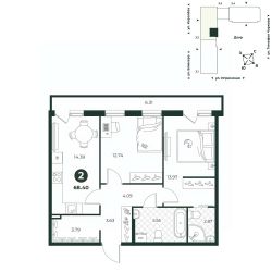 Двухкомнатная квартира с мастер-спальней, оборудованной гардеробной и санузлом. Терраса, на которую можно выйти из кухни и комнаты, отлично подходит для размещения зоны отдыха. В прихожей можно огранизовать полноценную зону для хранения. Ванная комната вмещает стиральную машину.